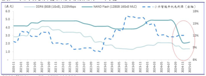以前就有过类似的情况,2023年NAND价格上涨后,小米2024年第一季度的智能手机毛利率,就从16.4%降到了14.8%。