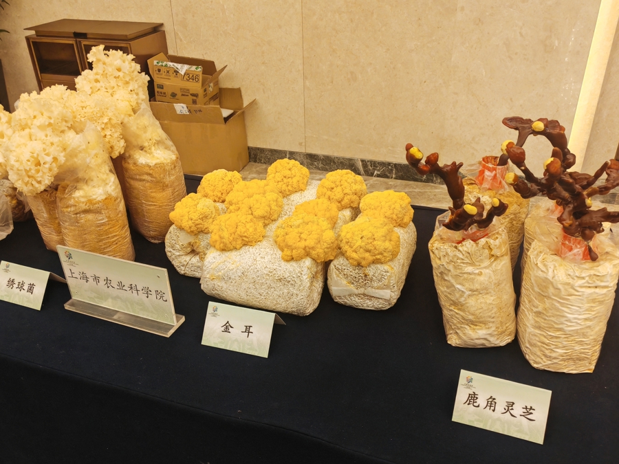 展台上,市农科院培育的绣球菌、金耳、鹿角灵芝(金奕伶/摄)