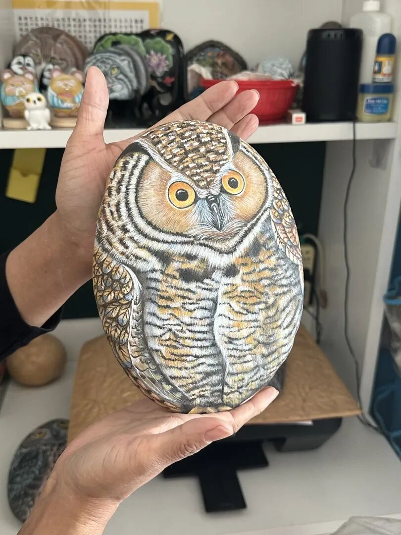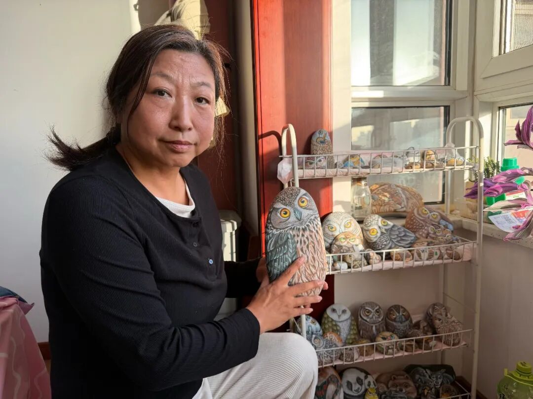 走进郭秀梅的家,她创作的“石头画”摆满了每个角落。桌上,为女儿绘制的“石头画像”眉眼含情;柜子里,石头上的小动物活灵活现,瓜果梨桃等“美食”栩栩如生;卧室靠窗的四层架子上,摆满了形态各异的猫头鹰……家里但凡能储物的地方,都藏着她的作品。